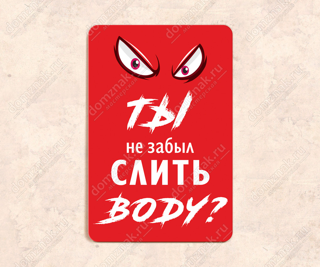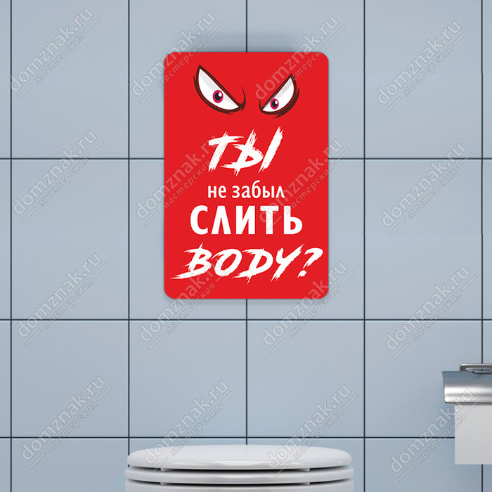 Табличка «Ты не забыл слить воду?» изготовлена из пластика ПВХ, толщиной 4 мм. Изображение наносится по технологии УФ-печати. Табличка предназначена для использования как в помещении, так и на улице.