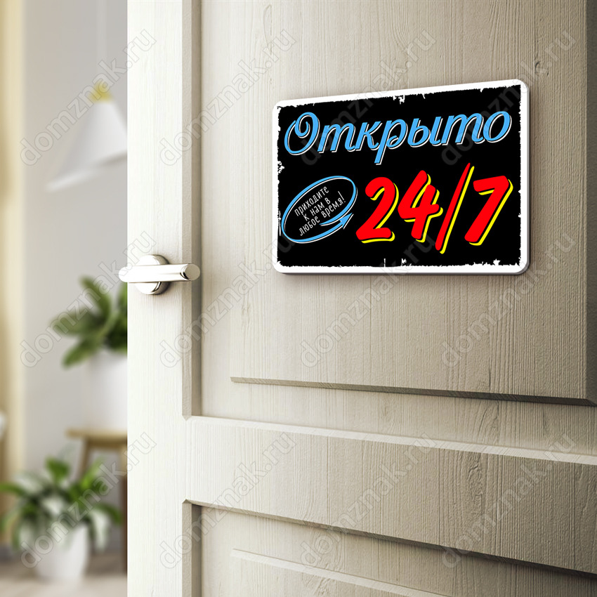 Табличка «Открыто 24/7 приходите к нам в любое время»