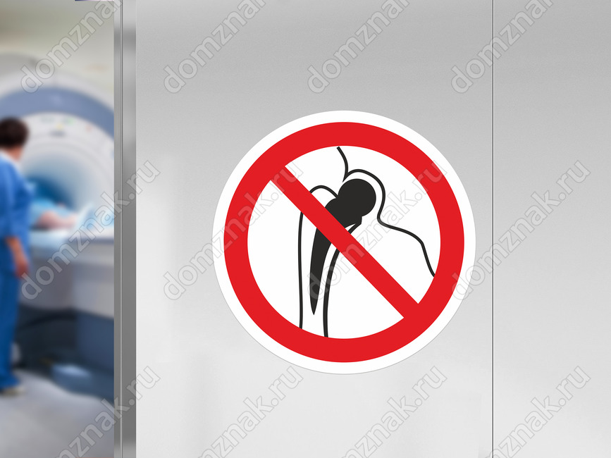Знак «Запрещается работа людей, имеющих имплантанты» изготавливается в нескольких вариантах: